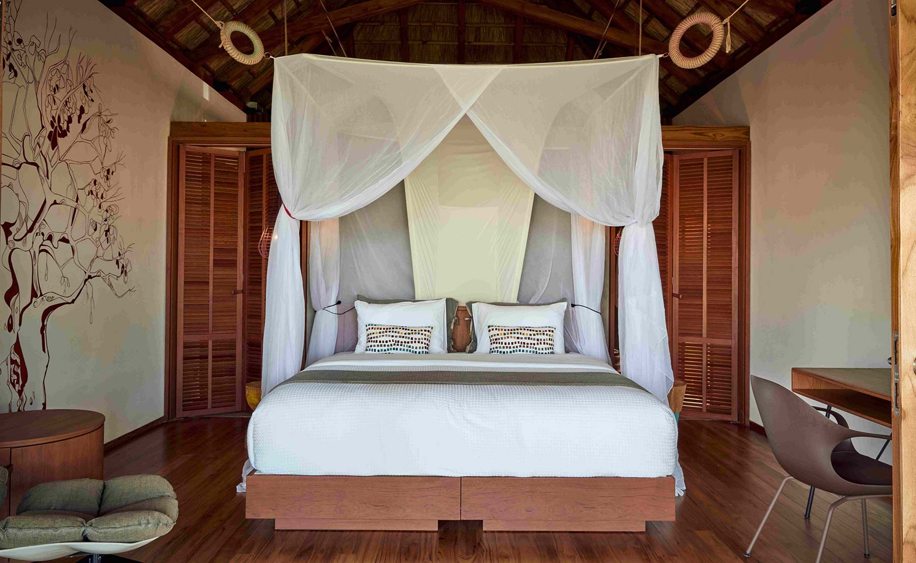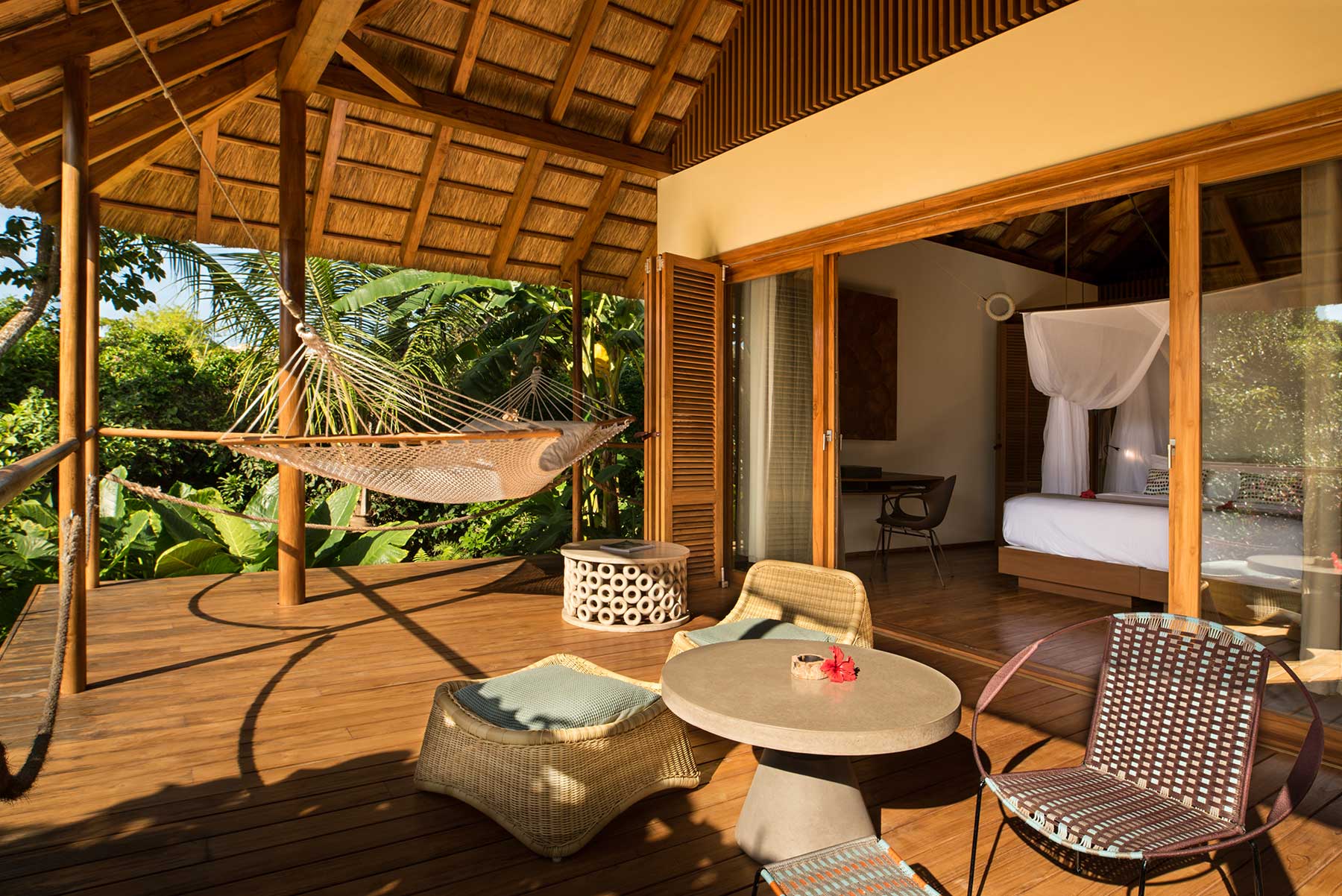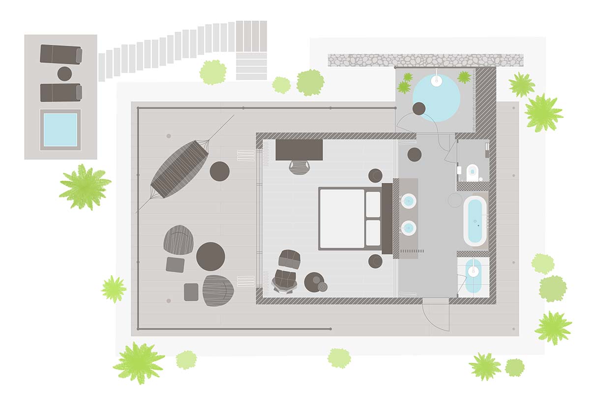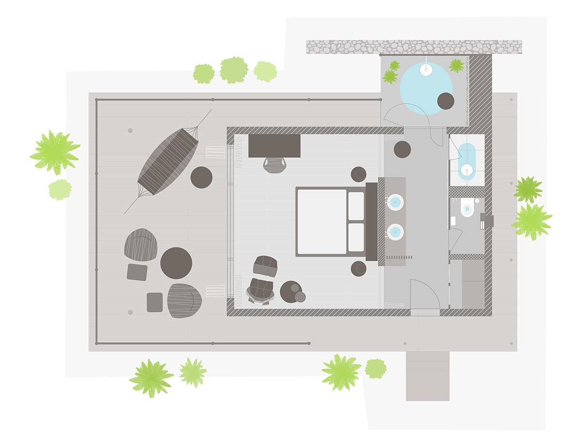 Designed to provide the ultimate in coziness, the bungalows are equipped with a mix of contemporary and curated local furniture and decorated with a range of African artwork. The outdoor showers complement the gleaming modern bathrooms indoors and the large private terraces provide an extended area that is ideal as an outdoor living room.