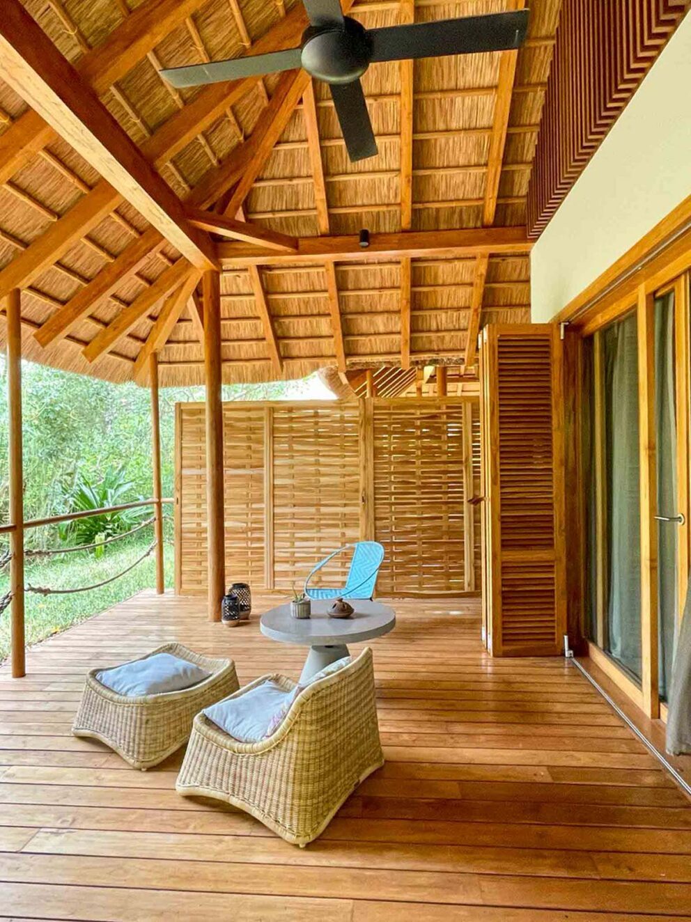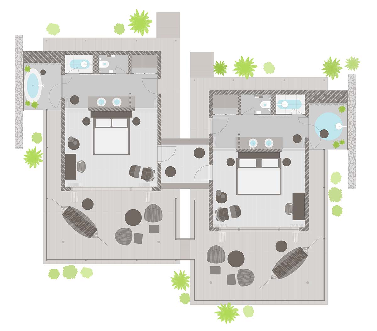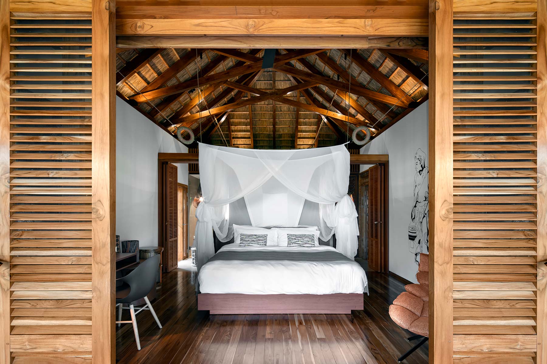 Designed to provide the ultimate in coziness, the bungalows are equipped with a mix of contemporary and curated local furniture and decorated with a range of African artwork. The outdoor showers complement the gleaming modern bathrooms indoors and the large private terraces provide an extended area that is ideal as an outdoor living room.
